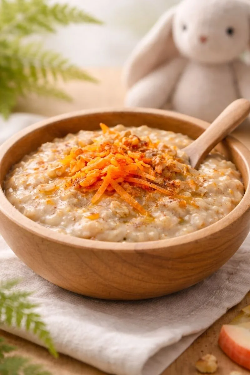 Ingredients: Rolled oats, carrot, apple, milk or water, cinnamon, ginger, nutmeg, vanilla