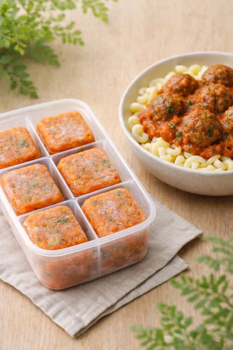 6–8 months: Sauce blended smooth; meatballs mashed or finely minced with sauce