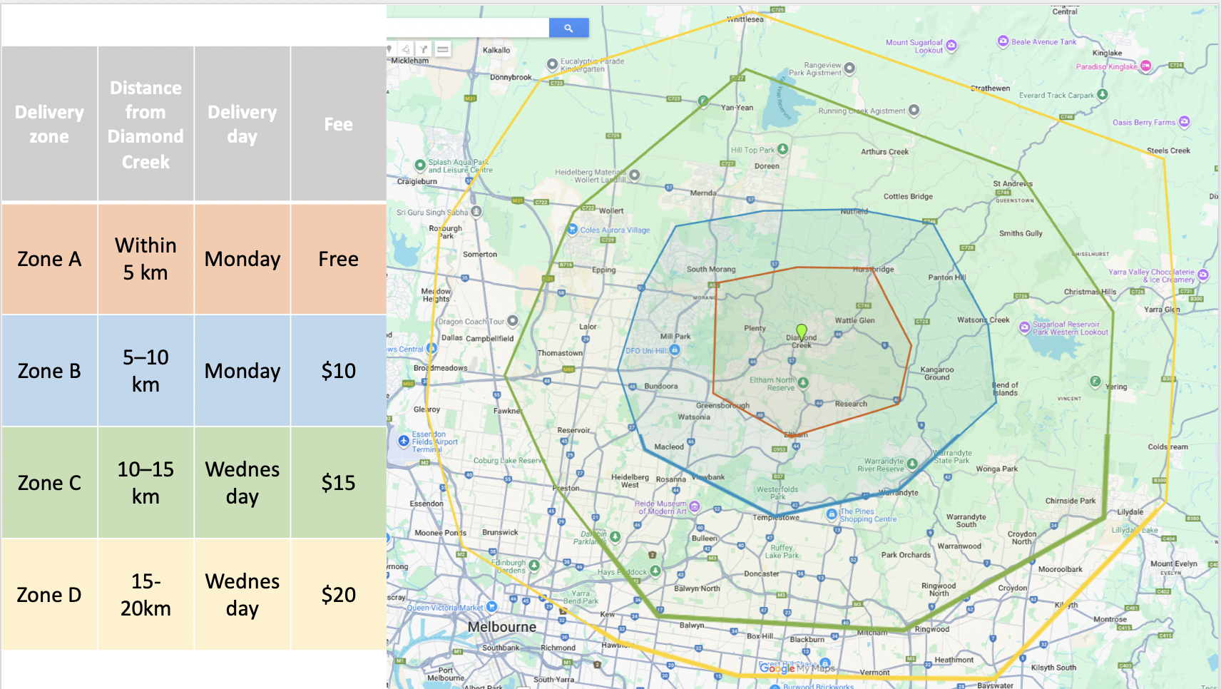 Delivery zones allow us to minimise driving time while ensuring meals arrive safely and on schedule. Zones are approximate and will be confirmed with you before your first delivery and are based on distance from Diamond Creek.