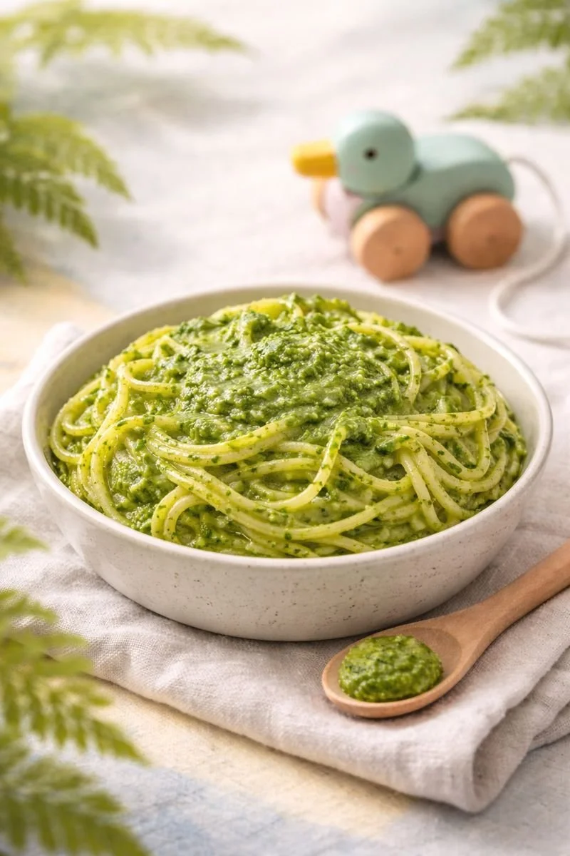 A green pesto providing iron from spinach and pine nuts, antioxidants from basil, fibre and vitamin C from zucchini, and monounsaturated fats from olive oil to support energy needs and nutrient absorption, with optional parmesan contributing calcium and protein.