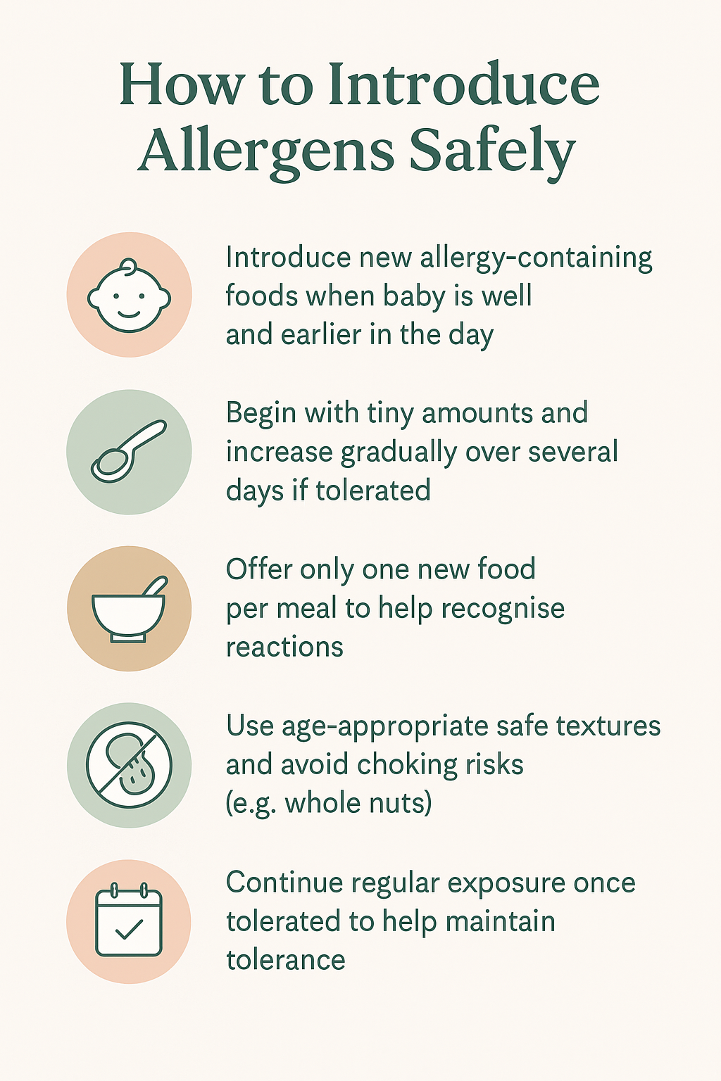 Introduce allergens one at a time, starting with a very small amount earlier in the day so your baby can be observed. Always offer allergens in textures appropriate for your child’s developmental stage — for example, smooth nut pastes mixed into purée rather than whole nuts. If no reaction occurs, gradually increase the amount over subsequent exposures. Once an allergen is tolerated, include it regularly in your child’s diet to help maintain tolerance.