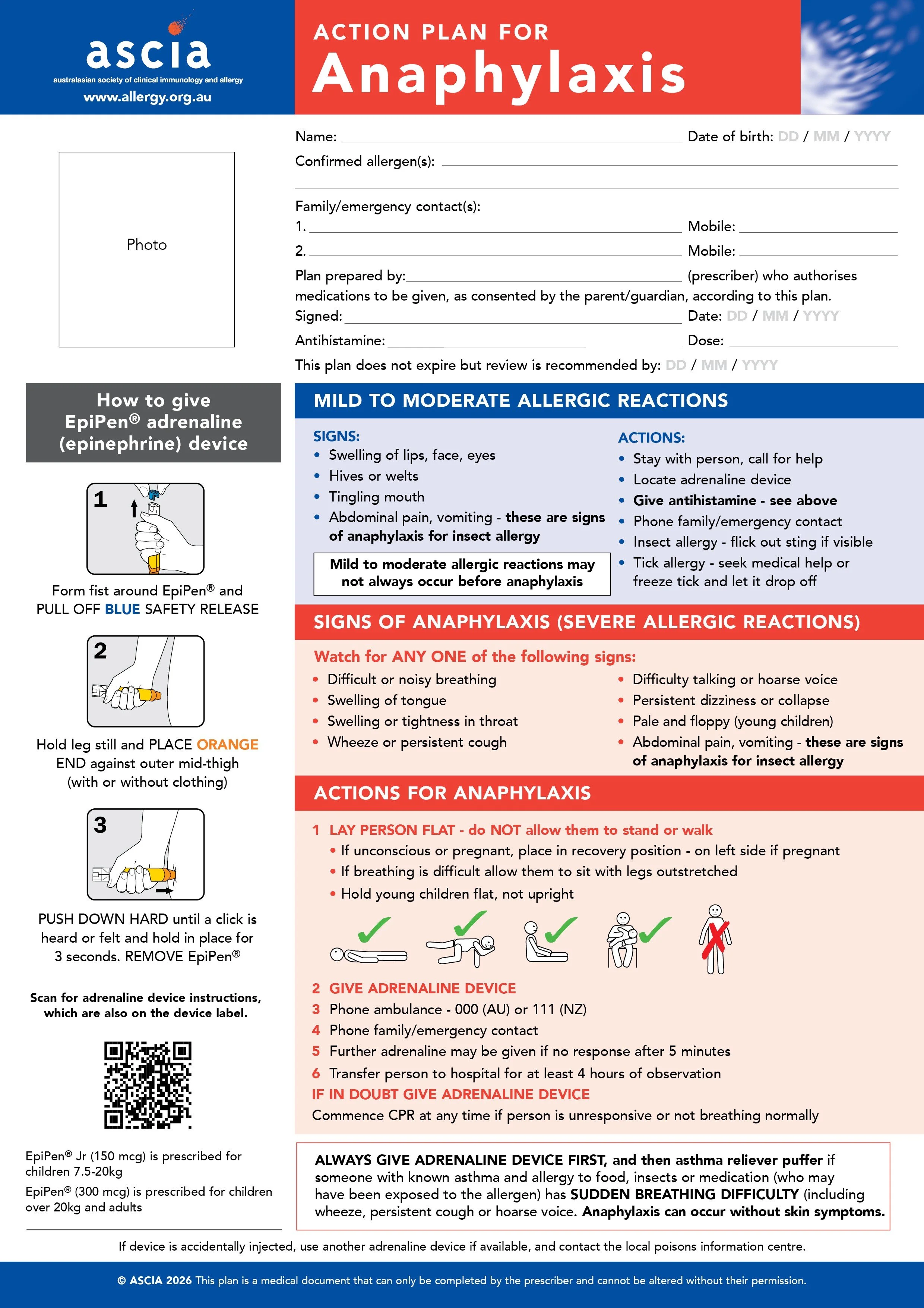 If your child has an ASCIA Action Plan and prescribed adrenaline, follow the plan and administer adrenaline immediately.